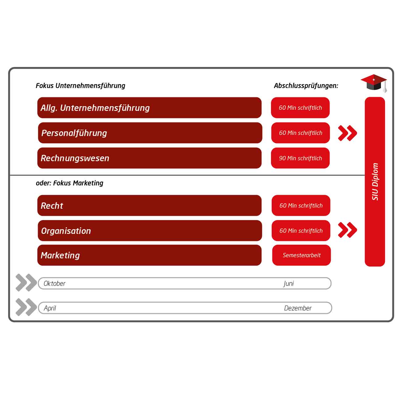Mit dem SIU Diplom erlangen Sie betriebswirtschaftliche Grundlagen für die Entscheidungsfindungen in kleinen und mittleren Betrieben. Der Lehrgang gibt mehr Sicherheit im Umgang mit Kunden, Mitarbeitenden und anderen Anspruchsgruppen. Inhaltlich entspricht der Lehrgang dem ersten Semester des Lehrgangs Fachmann/Fachfrau Unternehmensführung KMU. Eine nahtlose Weiterführung des Lehrgangs bis zum eidg. Fachausweis ist daher möglich.